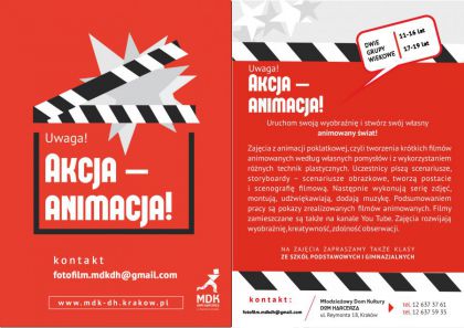 Uczestnicy pisz scenariusze, tworz storyboardy scenariusze obrazkowe, postacie i scenografi filmow. Nastpnie wykonuj seri zdj, montuj, udwikawiaj, dodaj muzyk. Podsumowaniem pracy s pokazy zrealizowanych filmw animowanych. Filmy zamieszczane s take na kanale You Tube. Zajcia rozwijaj wyobrani, kreatywno,zdolno obserwacji i budowania spjnego opowiadania. Warsztaty odbywaj si w kady czwartek od godziny 15.15 do 17.45.