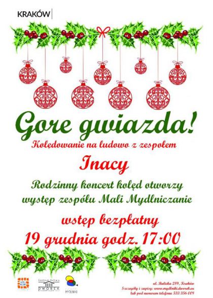 Pokolędujmy razem przy dźwiękach muzyki na żywo, którą przyniesie nam w prezencie zespół Inacy! Przed gwiazdą wieczoru wystąpi coraz jaśniej nam świecąca gwiazda- czyli zespół Mali Mydlniczanie! Zapraszamy rodziny z dziećmi, sąsiadów, przechodniów, obserwatorów, miłośników folkloru- wszystkich!.