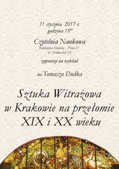 Wykad bdzie powicony krakowskim witraom na przeomie XIX i XX w. To szalenie ciekawy, a zarazem bardzo mao znany temat. Wdrujc ulicami naszego miasta, co r moemy napotka witrae z tego okresu. W lepszym lub gorszym stanie ciesz one oko wspczesnych mieszkacw naszego i turystw. Autor przedstawi zarwno witrae o tematyce sakralnej tak znanych twrcw jak np. Jzef Mehoffer, czy Stanisaw Wyspiaski oraz witrae o tematyce wieckiej projektowane np. przez nieco zapomnianego artyst Stefana Matejk. Wykad bdzie bogato zilustrowany przeroczami na ktrych przedstawiono wybrane krakowskie witrae.