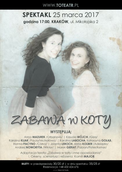 Zabawa w koty w opracowaniu TOTEATRU jest opowieci o trudnych miociach. Skomplikowanej wizi sistr oddzielonych emigracj i elazn kurtyn. Rnicy w postrzeganiu rzeczywistoci przez modych i dojrzae postaci. Rachunek zyskw i strat osobistych gwnej bohaterki oraz zgubna w skutkach intryga to gwne wtki spektaklu.