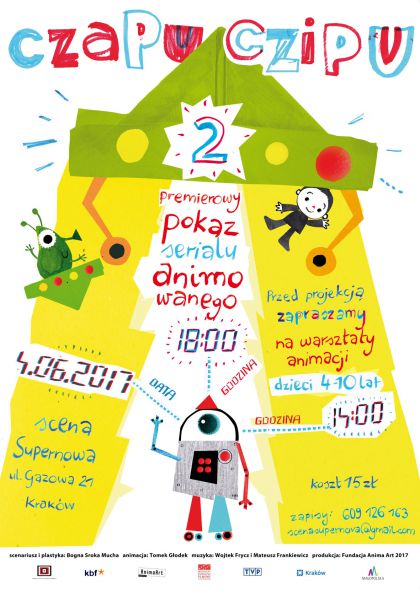Fundacja Anima Art producent serialu animowanego Czapu, Czipu ma zaszczyt zaprosić Dzieci w wieku 4-10 lat na warsztaty tworzenia filmu animowanego. Stworzymy Mini Studio Filmowe, dzieci będą mogły same przejść przez wszystkie etapy tworzenia filmu animowanego - od powstania scenariusza przez stworzenie plastyki i przygotowanie kukiełek do animacji poklatkowej. Efekt finalny zobaczą na pokazie zaraz po warsztatach wraz z premierowymi odcinkami Czapu, Czipu.
