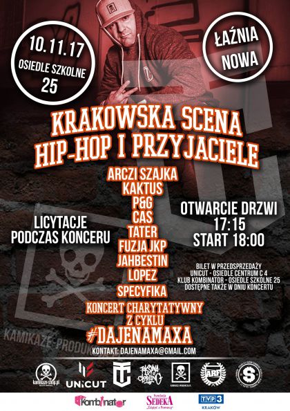 Gorco zapraszamy na charytatywny hiphopowy koncert, ktry odbdzie si 10.11.2017r. w Teatrze ania Nowa. Miejsce i artyci nie s przypadkowi, bo jak wiadomo Max wychowa si w Hucie. Szykujemy wiele niespodzianek. Podczas koncertu odbd si rwnie licytacje. Bdziecie te mogli kupi koszulki #DAJENAMAXA. Caa zebrana kwota zostanie przeznaczona na leczenie Maxa (przeszczep komrek macierzystych).. Max ma szanse stan na nogi. Artyci graj charytatywnie, bo kady z nich #DAJENAMAXA. Wiemy take, e kady z Was te #DAJENAMAXA, wic nie bdziemy biletowa wstpu. eby bawi si z nami wystarczy wesprze Maxa kwot nie mniejsz ni 25PLN wpacajc na konto 67 1140 2004 0000 3902 4269 8924 w tytule podajc swoje imi i nazwisko/KONCERT, a my wpiszemy Was na list. Jeli zdecydujecie si przyj dopiero w dniu koncertu, nie zapomnijcie woy przynajmniej 30 PLN do puszki, ktra bdzie staa przy wejciu.