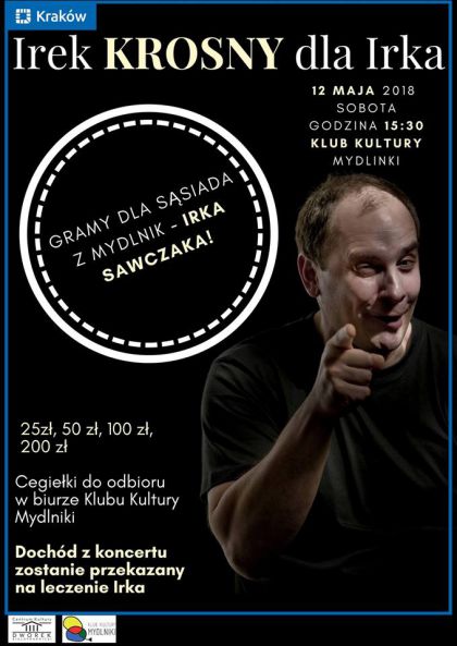 Szanowni Pastwo kwestia niezwykle wana i warta zatrzymania! Mianowicie 12 maja 2018 roku o godz. 15.30 odbdzie si CHARYTATYWNY WYSTP najsynniejszego polskiego mima Ireneusza Krosnego na rzecz mieszkaca Mydlnik- Ireneusza Sawczaka chorujcego na zoliwy nowotwr mzgu. Artysta wystpi z nowym programem pt. Mowa ciaa. Dochd z wystpu zostanie przekazany na leczenie Irka Sawczaka , cegieki w cenie 25 z, 50 z, 100 z, 200 z mona naby w Klubie Kultury Mydlniki przed wystpem. Z caego serca zapraszamy i zachcamy do wsparcia!