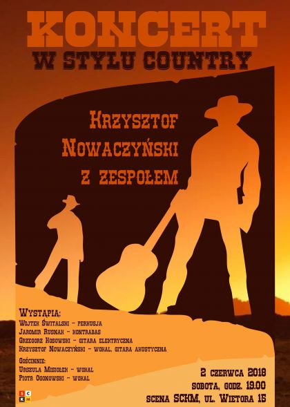 Zapraszamy wszystkich fanw muzyki country, rockabilly, a take klimatw western na wystp Krzysztofa Nowaczyskiego, ktry zapiewa i zagra dla Was covery znanych klasykw gatunku wraz z zespoem w skadzie: Wojtek wiatalski perkusja, Jaromir Rusnak kontrabas, Grzegorz Kosowski gitara elektryczna, Krzysztof Nowaczyski wokal, gitara akustyczna. Gocinnie wystpi: Urszula Misioek wokal, Piotr Ogonowski wokal.