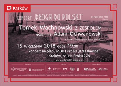 W dniu 15 września (sobota) 2018 r., na plenerowej scenie Młodzieżowego Domu Kultury Fort 49 „Krzesławice” odbędzie się koncert „Droga do Polski”. Wystąpią: Tomek Wachnowski z muzykami i gościnnie Adam Ochwanowski. Wykonają utwory z płyty „Kołomyja i pic” oraz wybrane utwory, które nawiązywać będą do tematyki Ojczyzny i wolności. Koncert organizowany jest w ramach 100. rocznicy odzyskania przez Polskę niepodległości. Początek koncertu o godz. 19.00.