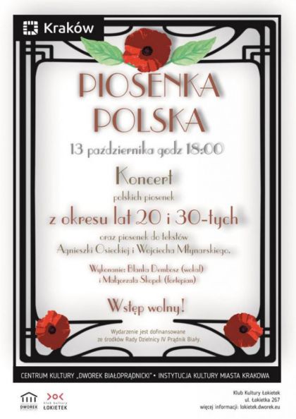Klub Kultury okietek zaprasza na pierwszy koncert na swojej scenie muzycznej. W programie polskie utwory z lat 20 i 30-tych oraz piosenki do tekstw Agnieszki Osieckiej i Wojciecha Mynarskiego.