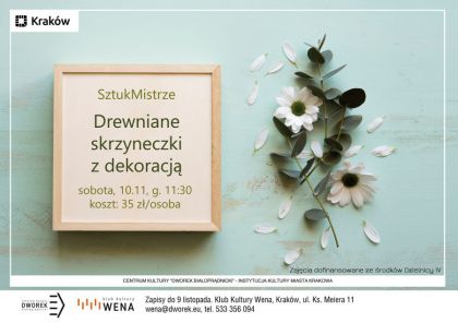 Nowy cykl sobotnich wydarzeń w Klubie Wena. Raz w miesiącu będziemy spotykać się, aby rozwinąć swoją kreatywność i oswoić techniki sztuki. Za każdym razem w nową metodą będziemy wytwarzać przedmiot użytkowy lub ozdobę. Bieżące informacje na stronie: wena.dworek.eu