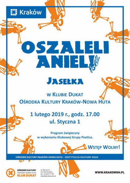 Klub Dukat Orodka Kultury Krakw-Nowa Huta (ul. Styczna 1) zaprasza 1 lutego o godz. 17.00 na jaseka. Czy anioom zdarza si oszale i co z tego moe wynikn? Czy pasterze mog si leni, a do tego spiera z krlami? Kto podsuwa ze pomysy Herodowi? Odpowiedzi na te pytania poznaj widzowie widowiska Oszaleli Anieli. Coroczny jasekowy wystp Klubowej Grupy Poetica stanowi dobr tradycj Klubu Dukat, a na jej stray stoj okoliczni mieszkacy. W tegorocznej edycji, wieczcej okres boonarodzeniowy, wystpi 14 osb, a w obsadzie aktorskiej nie zabraknie niespodzianek. Brawurowa akcja, ywa narracja i barwne stroje to od lat znak firmowy dukatowych jaseek, na ktre gorco zapraszaj organizatorzy i artyci.