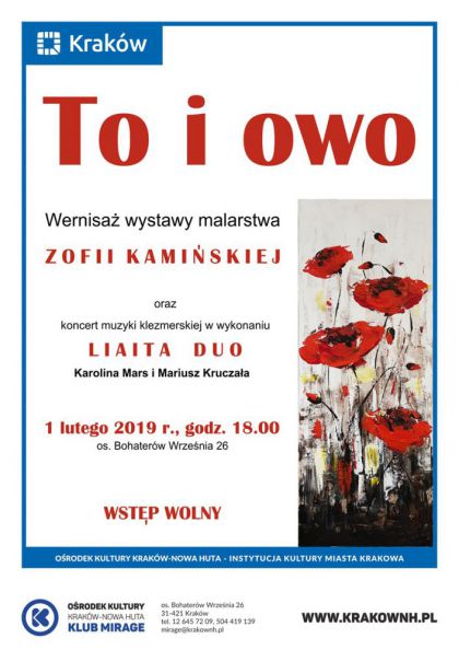 Klub Mirage Orodka Kultury Krakw-Nowa Huta (os. Bohaterw Wrzenia 26) zaprasza 1 lutego o godz. 18.00 na wernisa wystawy malarstwa Zofii Kamiskiej. Spod pdzla malarki wychodz kwiaty, pejzae, a ostatnio rwnie malarskie formy abstrakcyjne. Cao ujta jest w wysmakowanej i przemylanej kolorystyce. Talent i duy zmys obserwacji pozwalaj artystce siga po najtrudniejsze tematy, ze swobod i radoci tworzenia przenosi je na ptno i papier. Wernisa uwietni koncert muzyki klezmerskiej w wykonaniu LIAITA DUO w skadzie Karolina Mars i Mariusz Kruczaa.