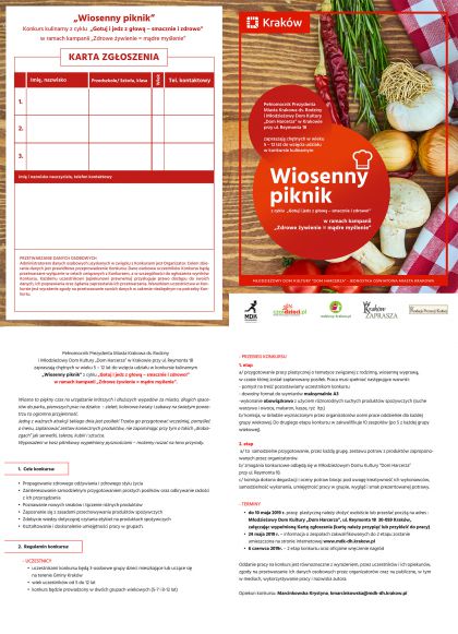 Pełnomocnik Prezydenta Miasta Krakowa ds. Rodziny i Młodzieżowy Dom Kultury „Dom Harcerza” w Krakowie przy ul. Reymonta 18 zapraszają chętnych w wieku 5 – 12 lat do wzięcia udziału w konkursie kulinarnym „Wiosenny piknik” z cyklu „Gotuj i jedz z głową – smacznie i zdrowo!” w ramach kampanii „Zdrowe żywienie = mądre myślenie”.