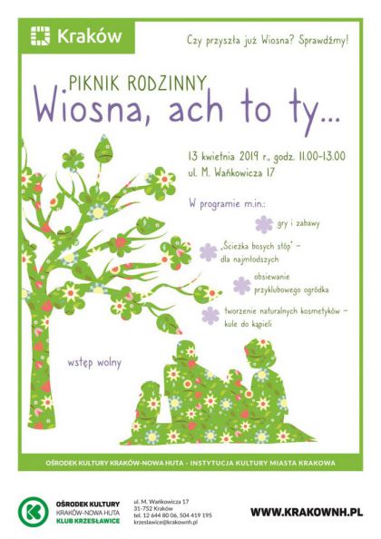 O tej porze roku przyroda zachwyca, zaciekawia i cieszy nasze oczy ekspansj zieleni. A chce si spdza czas pord natury. Dlatego Klub Krzesawice Orodka Kultury Krakw-Nowa Huta (ul. M. Wakowicza 17) zaprasza 13 kwietnia od godz. 11.00 na piknik Wiosna, ach to ty. Urzdzimy ciek bosych stp dla najmodszych, zorganizujemy liczne gry i zabawy, zajmiemy si przygotowaniem naturalnych kosmetykw. Wsplnymi siami urzdzimy kwietny ogrdek wok Klubu, by soneczniki, maciejka, bratki i ubin cieszyy oczy a do jesieni i napaway dum tych, ktrzy je zasiali.