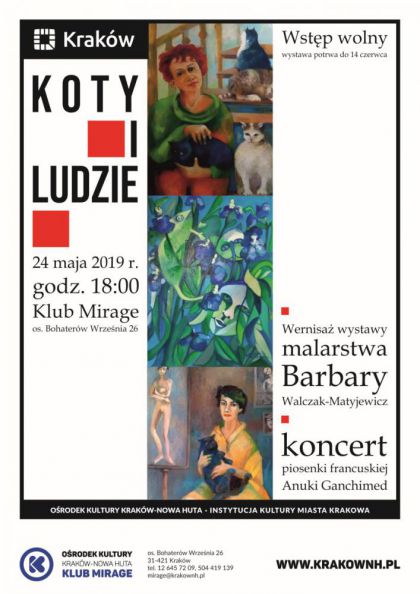 Galeria M Plus w Klubie Mirage Orodka Kultury Krakw-Nowa Huta (os. Bohaterw Wrzenia 26) zaprasza 24.05 o godz. 18.00 na wernisa wystawy malarstwa Barbary Walczak-Matyjewicz. Autorka prac swoj przygod z malarstwem rozpocza w pracowni Domu Kultury Pod Baranami, prowadzonej przez prof. Ludwika Pindela. Studia i praca zawodowa sprawiy, e zarzucia malarstwo na okoo 20 lat, jednak potrzeba tworzenia daa o sobie zna ponownie. Barbara Walczak-Matyjewicz jest wspzaoycielk grupy malarskiej Pasja, ktr obecnie prowadzi krakowski artysta malarz Mariusz Dudka.