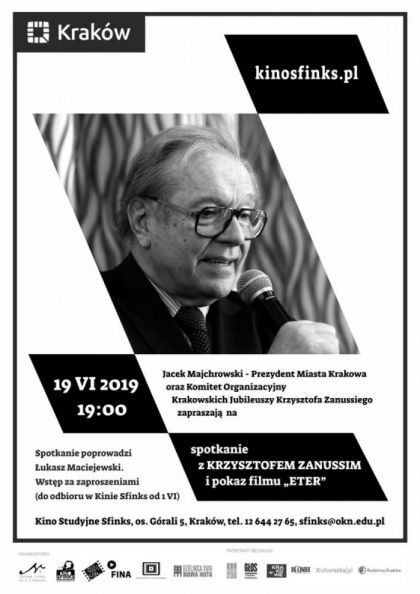 Prezydent Miasta Krakowa Jacek Majchrowski, Komitet Organizacyjny Krakowskich Jubileuszy Krzysztofa Zanussiego oraz Kino Sfinks zapraszaj na spotkanie z Krzysztofem Zanussim i pokaz filmu Eter. Spotkanie poprowadzi ukasz Maciejewski. Wstp za zaproszeniami - do odbioru w Kinie Studyjnym Sfinks (od 1 czerwca).