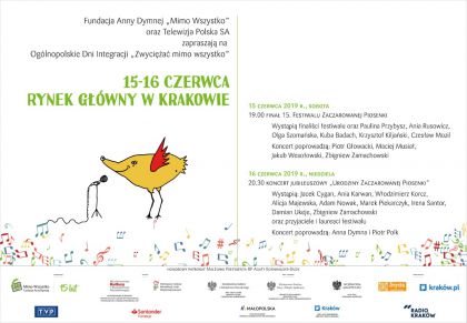 Ju 15 czerwca na Rynku Gwnym w Krakowie odbdzie si fina 15. Festiwalu Zaczarowanej Piosenki. 12 utalentowanych niepenosprawnych wokalistw wystpi na jednej scenie z gwiazdami polskiej brany muzycznej: Kub Badachem, Krzysztofem Kiliaskim, Czesawem Mozilem, Paulin Przybysz, Ani Rusowicz, Olg Szomask.