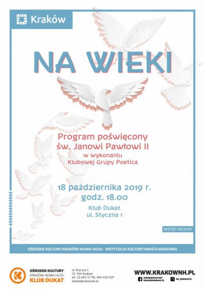 Ten wyjtkowy wieczr rozpocznie si 18 padziernika o godz. 18.00 w Klubie Dukat Orodka Kultury Krakw-Nowa Huta (ul. Styczna 1).