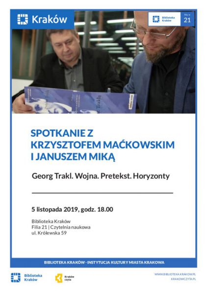 Krzysztof Maćkowski i Janusz Mika opowiedzą m.in. o postaci Georga Trakla (1887-1914), zmarłego w Krakowie austriackiego poety-katastrofisty doby modernizmu; wskrzeszeniu po 20 latach Ogólnopolskiego Konkursu Poetyckiego im. Georga Trakla, idei i organizacji kolejnych sześciu edycji interdyscyplinarnego Festiwalu Literacko-Artystycznego Trakl-Tat, a także o swoich książkach.