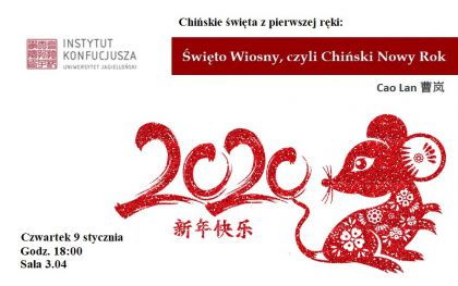 W trakcie spotkania lektorka IK Kasia (Cao Lan (曹岚) w ramach cyklu „Chińskie święta z pierwszej ręki” opowie o obchodach Święta Wiosny czyli Chińskiego Nowego Roku. Będzie to okazja, żeby dowiedzieć się, skąd pochodzą tradycje i zwyczaje tego najważniejszego z chińskich świąt. Lektorka powie też o tym co przyniesie Nowy Rok Szczura, który rozpocznie się już 25 stycznia.