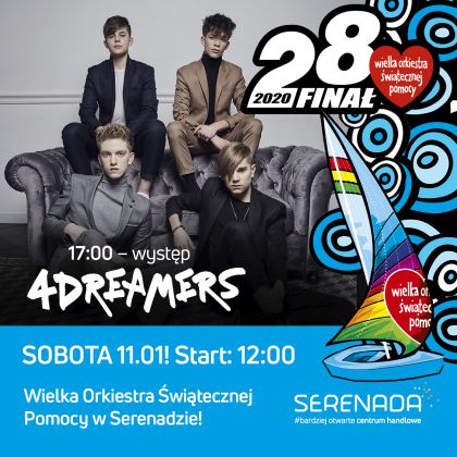 Ju w najblisz sobot 11 stycznia, Centrum Serenada zamieni si w miejsce przepenione dobroci serc i wzajemnym wsparciem. Te wszystkie pikne emocje pojawi si za spraw 28. Finau Wielkiej Orkiestry witecznej Pomocy, ktrego sztab bdzie rwnie w Serenadzie. Na odwiedzajcych czekaj licytacje wyjtkowych przedmiotw, liczne atrakcje i pokazy artystyczne, a take moliwo realnej pomocy. Gwiazd wieczoru bdzie zesp 4Dreamers.