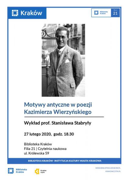 Zapraszamy na wykład prof. Stanisława Stabryły – polskiego filologa klasycznego, profesora zwyczajnego Uniwersytetu Jagiellońskiego, autora publikacji naukowych i popularnonaukowych – na temat literatury łacińskiej okresu augustowskiego oraz kultury antycznej, przybliży sylwetkę i twórczość Kazimierza Wierzyńskiego, polskiego poety, prozaika, eseisty, zdobywcy złotego medalu w konkursie literackim IX Letnich Igrzysk Olimpijskich w Amsterdamie w 1928 r. Współzałożyciela grupy poetyckiej Skamander.