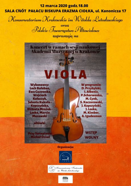 Akademia Muzyczna w Krakowie, Konserwatorium Krakowskie im. Witolda Lutosławskiego, Polskie Towarzystwo Altowiolowe oraz Oddział Muzeum Narodowego w Krakowie w Pałacu Biskupa Ciołka zapraszają na koncert w ramach Sesji naukowej Akademii Muzycznej w Krakowie w wykonaniu polskich altowiolistów, pracowników naukowych i dydaktycznych polskich uczelni muzycznych.