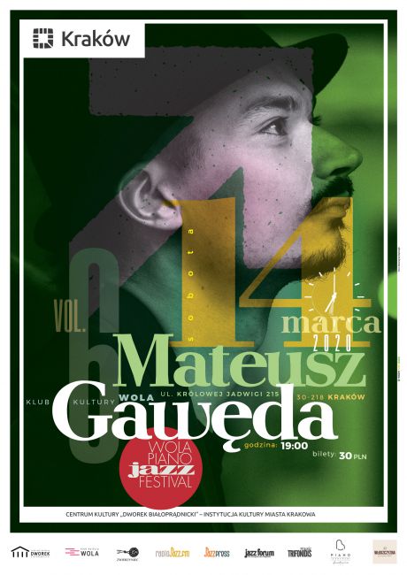 Bilety dostpne w Klub Kultury Wola - filia Centrum Kultury Dworek Biaoprdnicki, oraz online: https://ekobilet.pl/centrum-kultury-dworek-bialopradnicki/wola-piano-jazz-festival-vol-6--mateusz-gaweda-34888/409438-bilety-na-koncert