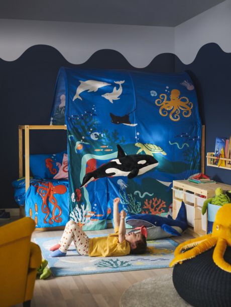 We wnętrzach nowego Działu dla Dzieci w IKEA Kraków królują produkty z kolekcji BLÅVINGAD. Do jej wykonania wykorzystano materiały wytworzone z odpadów plastikowych zebranych do 50 km od linii brzegowej, co pomogło ograniczyć zanieczyszczenie mórz i oceanów. Wśród nowości znalazły się m.in. pościele i poduszki z motywami marynistycznymi, dywan zmieniający podłogę w otwarte morze, baldachim nad łóżko z morskimi stworzeniami, ręcznik w kształcie rekina czy pluszaki, które w dniach otwarcia będą można kupić z rabatem do -20%.