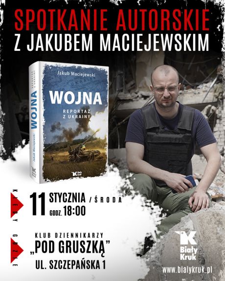 Wydawnictwo Biały Kruk oraz Klub Dziennikarzy "Pod Gruszką" zapraszają serdecznie na spotkanie autorskie z Jakubem Maciejewskim poświęcone jego wstrząsającemu reportażowi "Wojna. Reportaż z Ukrainy".