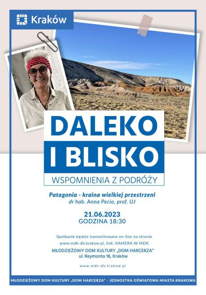 Cykl „Daleko i blisko” to niezwykłe spotkania z podróżnikami, fotografami, osobami ciekawymi świata i ludzi. Zapraszamy osoby, które chcą podzielić się swoimi wspomnieniami z podróży. Tym razem naszym przewodnikiem będzie dr hab. Anna Pecio, prof. UJ., która przybliży nam Patagonię.