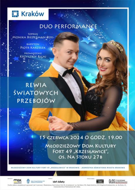 Wykonawcami koncertu są znakomici soliści, którzy szturmem zdobywają serca publiczności w całym kraju i za granicą - prosto z trasy po USA zaprezentują się Państwu Monika Biederman-Pers (sopran) oraz Piotr Karzełek (baryton). Artyści tworzą zgrany i bardzo efektowny duet taneczno-wokalny „DUO PERFORMANCE”, którego występy każdorazowo spotykają się z owacyjnym aplauzem. Wyjątkowe doznania wokalno-muzyczne potęgują piękne kostiumy, energetyczna choreografia, oprawa świetlna i multimedialna. Przenosimy widzów na sceny całego świata.