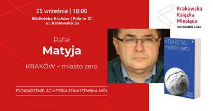 Spotkanie z Rafałem Matyją – laureatem nagrody Krakowska Książka Miesiąca – i wręczenie nagrody za książkę Kraków – miasto zero. Książka przewrotna, w której autor opowiada o cmentarzu Rakowickim, jako punkcie odniesienia do opisu miasta. Autor tak pisze o książce: Kraków jest dobrym miejscem do mieszkania, ale jeszcze lepszym do studiów nad odchodzącymi wzorcami miejskości. Do przyglądania się narodzinom jej nowych form. Rozmowę poprowadzi Agnieszka Staniszewska-Mól.