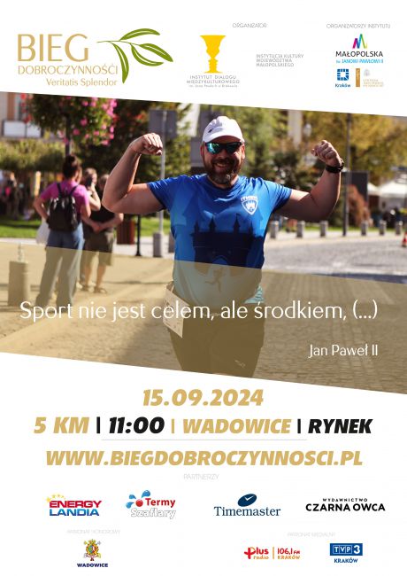 Z przyjemnością informujemy, że 15 września 2024 odbędzie się w Wadowicach coroczny Bieg Dobroczynności – Veritatis Splendor na dystansie 5 km. Chcemy w ten sposób upamiętnić dzieło Św. Jana Pawła II oraz promować aktywność fizyczną wśród mieszkańców Wadowic i okolic.