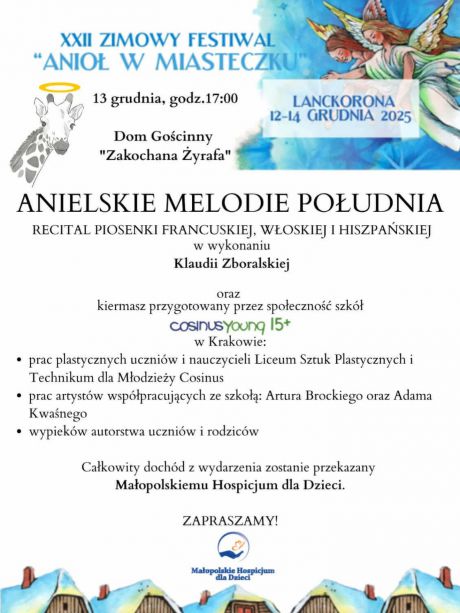 13 grudnia o godzinie 17.00 w nietuzinkowych wnętrzach Domu Gościnnego Zakochana Żyrafa w Lanckoronie odbędzie się niezwykłe wydarzenie przygotowane przez społeczność szkół CosinusYoung 15+ w Krakowie. W ramach XXII Zimowego Festiwalu „Anioł w Miasteczku”, jednego z najbardziej rozpoznawalnych grudniowych wydarzeń artystycznych w regionie, publiczność będzie miała okazję uczestniczyć w recitalu „Anielskie Melodie Południa”. Koncert w wykonaniu Klaudii Zboralskiej zabierze uczestników w muzyczną podróż po Francji, Włoszech i Hiszpanii, tworząc wieczór o wyjątkowej, ciepłej i świątecznej atmosferze.