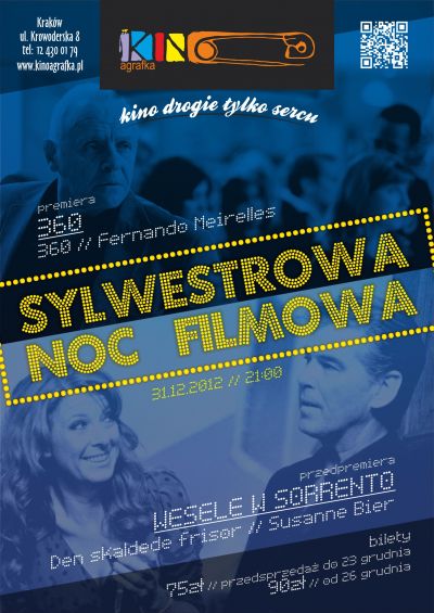 Tradycyjnie 31 grudnia zapraszamy na Sylwestrow Noc Filmow do Agrafki. W programie filmowym najnowsza produkcja Fernando Meirellesa 360, oraz przedpremierowo WESELE W SORRENTO Susanne Bier. Ponadto co do przegryzienia, napoje bezalkoholowe i lampka wina musujcego o pnocy.