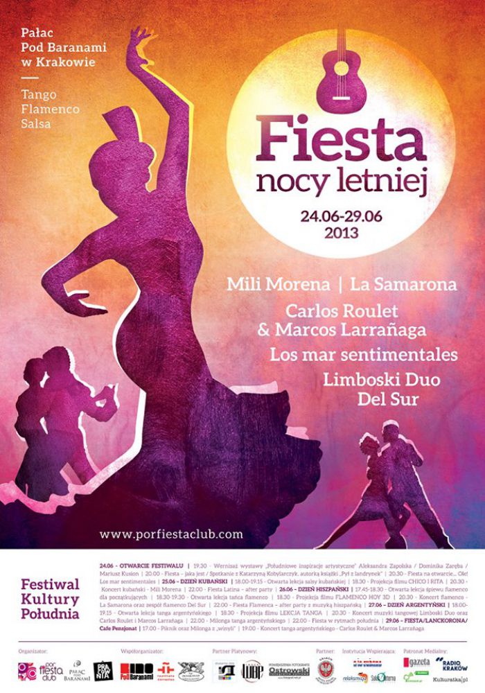 Fiesta Nocy Letniej, czyli Festiwal Kultury Południa, organizowany przez Por Fiesta Club i Pałac pod Baranami we współpracy z Kinem Pod Baranami i Instytutem Cervantesa w Krakowie, to przede wszystkim koncerty muzyki i tańca flamenco, tanga i salsy. Festiwal to również wystawy artystycznych fotografii, poezja inspirowana tańcem, warsztaty tańca i piewu, kultowe filmy kina iberoamerykańskiego oraz spotkania inspirowane kulturš Południa dziedzictwem muzycznym Półwyspu Iberyjskiego i Ameryki Łacińskiej.