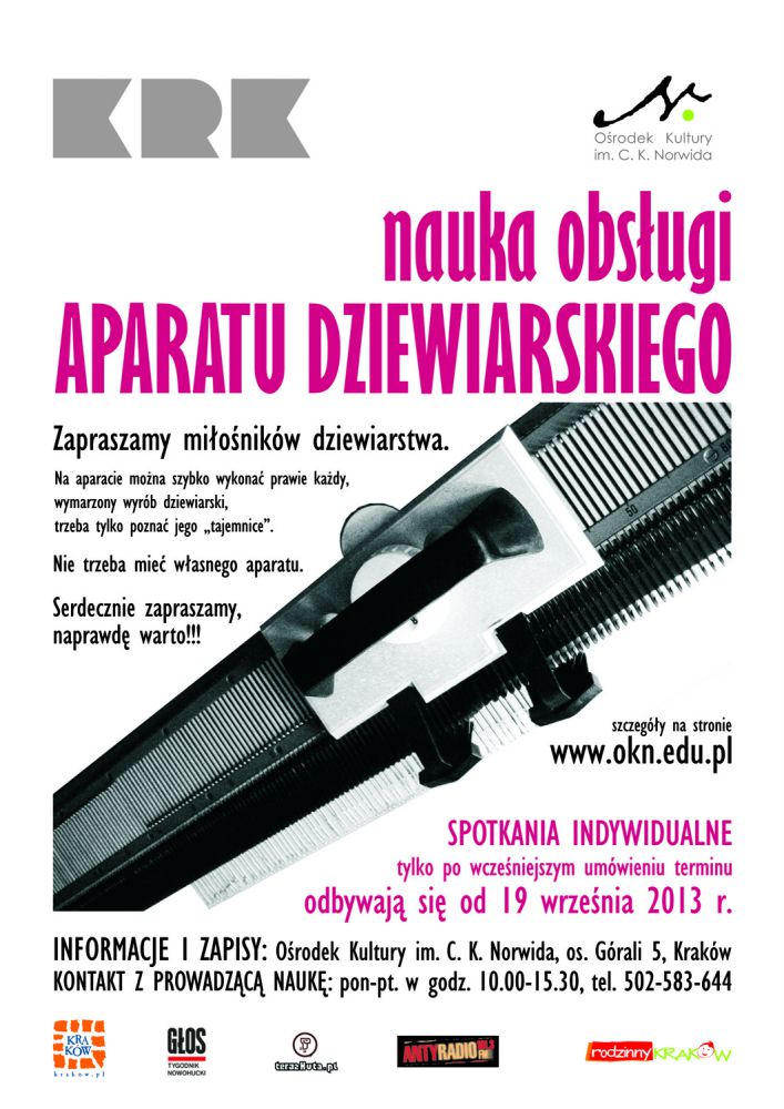 Zapraszamy na indywidualne spotkania, podczas których można się będzie nauczyć jego obsługi. Aparat i włóczki w różnych kolorach czekajš. Ci, którzy majš własny aparat dziewiarski (wszystkie działajš na tej samej zasadzie) mogš zakończyć spotkania po etapie nauki. Ci, którzy go nie majš, mogš korzystać z naszego aparatu i u nas wykonywać sobie z naszych włóczek różne wyroby.