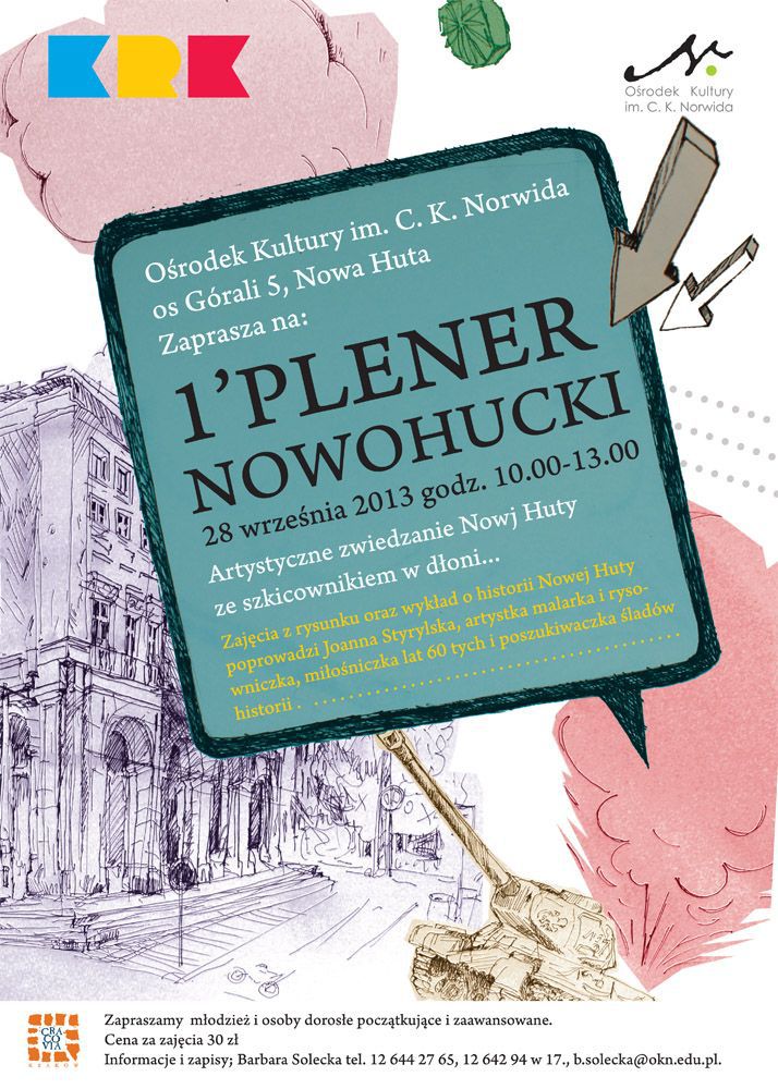 Zapraszamy młodzież i osoby dorosłe (poczštkujšce i zaawansowane) na artystyczne zwiedzanie Nowej Huty ze szkicownikiem w dłoni. Zajęcia rysunku, oraz wykład o historii Nowej Huty poprowadzi Joanna Styrylska - artystka, malarka i rysowniczka, miłoœniczka lat 60-tych i poszukiwaczka œladów historii.