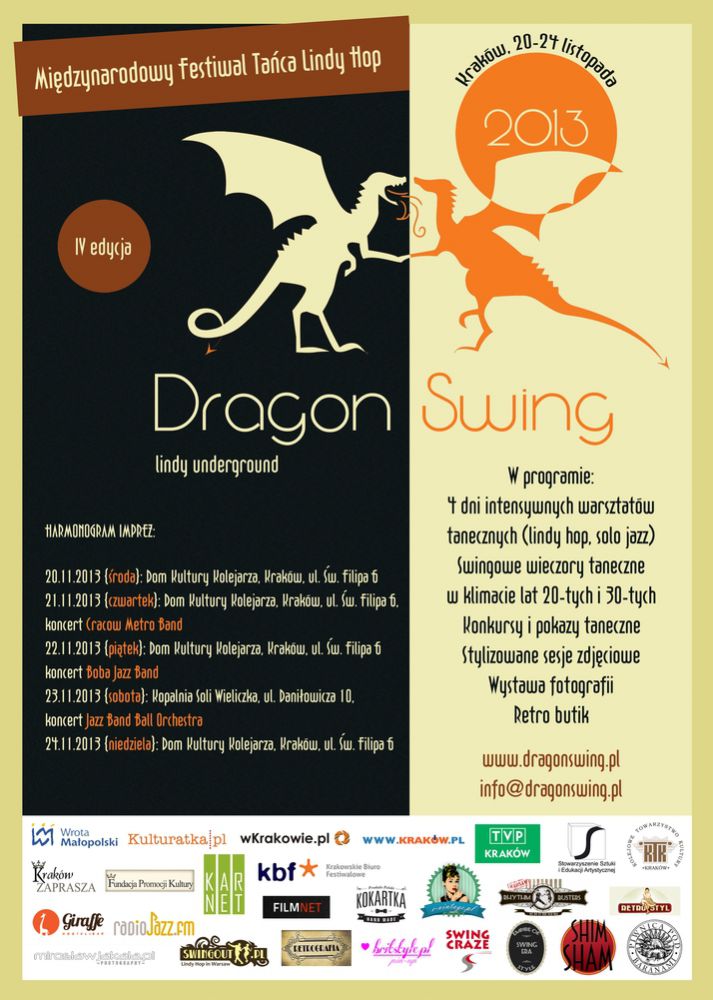 Sekcja Kultury, Muzyki i Tańców Swingowych KMiTa Kolejowego Towarzystwa Kultury w Krakowie ma zaszczyt zaprosić Państwa na czwartš już edycję Międzynarodowego Festiwalu Tańca Lindy Hop Dragon Swing 2013! Cztery dni warsztatów tanecznych na kilku poziomach zaawansowania, pięć imprez w klimacie oddajšcym atmosferę Złotej Ery Swingu przy akompaniamencie najlepszych krakowskich Big Bandów jazzowych, pokazy instruktorów z różnych zakštków wiata oraz doskonałe międzynarodowe towarzystwo na parkiecie wszystko to dostarczy Państwu niezapomnianych wrażeń rodem z lat międzywojennych i porwie do tańca nawet tych, których przygoda z Lindy Hop dopiero się zaczyna!