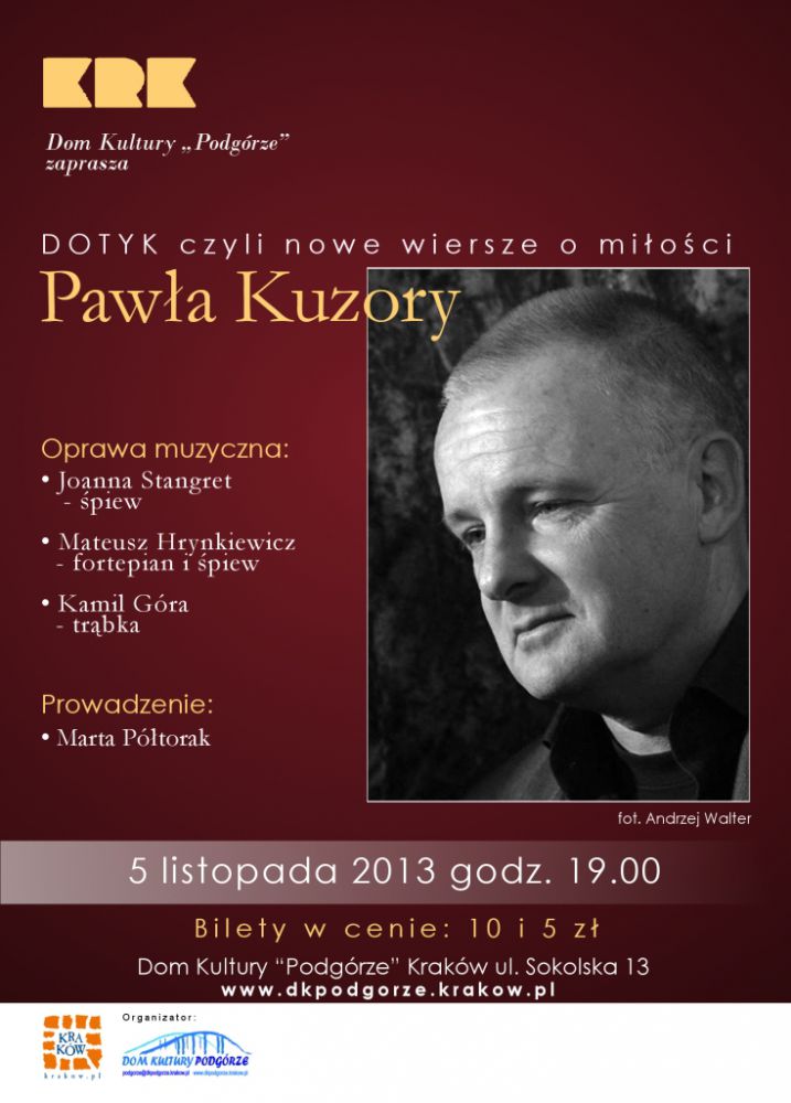 W ramach spotkania przedstawione zostanš nowe, niepublikowane utwory, zebrane w cyklu Dotyk. Paweł Kuzora będzie odpowiadał na pytania w formie kwestionariusza artystycznego z wierszami. Dzięki temu dowiemy się czym różni się poezja miłosna od kiczu, a także w czym jest do niego podobna. Autor przedstawi kilka osobistych refleksji na temat erotyków oraz odpowie na pytanie czy poezji i Internetowi jest po drodze