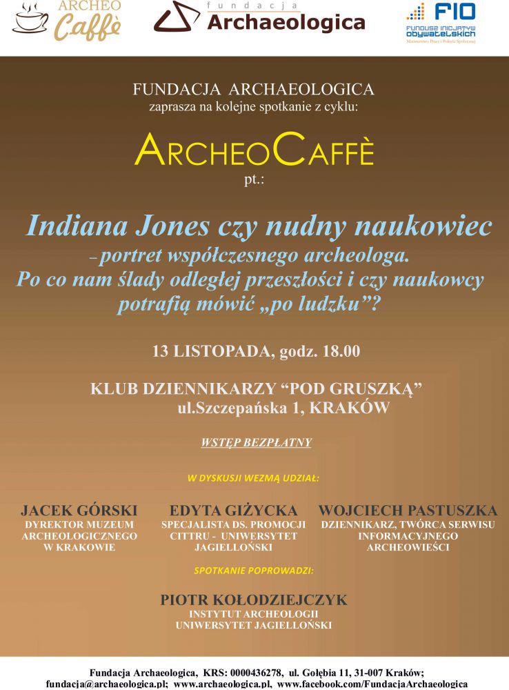 Cykl spotkań ArcheoCaffe jest jednym z etapów realizowanego przez Fundację Archaeologica projekt pt. Silna organizacja narzędziem w ochronie dziedzictwa archeologicznego, współfinansowanego z dotacji Funduszu Inicjatyw Obywatelskich Ministerstwa Pracy i Polityki Społecznej.