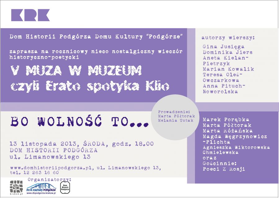 Już 13 listopada w Krakowie - Podgórzu odbędzie się rocznicowe spotkanie w cyklu „Muza w Muzeum, czyli Erato spotyka Klio”. Tym razem tematykš przewodniš będzie wolnoœć. Wolnoœć to …. tu każdy z nas może dopisać własnš definicję. Wolnoœć zawsze byłš jednš z kluczowych wartoœci., a przeszłoœci walczono o niš i szablš i piórem. Ile ludzi tyle odmian wolnoœci; ilu poetów tyle wierszy o niej traktujšcych. Historia zabierze nas w podróż do Podgórza skšd w ostatnich dni paŸdziernika 1918 roku, Antoni Stawarz kierował bezkrwawš akcjš wyzwalania Krakowa. Podczas spotkania wystšpiš poeci krakowscy oraz goœcie zaproszeni z Federacji Rosyjskiej. W czasie spotkania poezji i historii towarzyszyć będzie „ikonografia wolnoœci” w dosłownym i metaforycznym ujęciu.