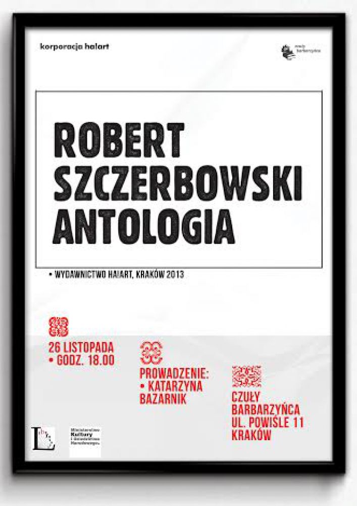 Korporacja Ha!art zaprasza na spotkanie z wokół "Antologii" Roberta Szczerbowskiego, stanowišcej zbiór trzech utworów, układajšcych się w logiczne ogniwa literackiego rozwoju autora. Pozycja ukazała się w serii Liberatura podczas tegorocznej Ha!wangardy.