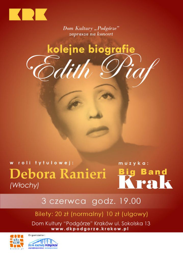 Dnia 03.06.2014 krakowski zespół grajšcy jazz i muzykę rozrywkowš- Big Band Krak razem z wokalistkš Deborš Ranieri, da koncert poœwięcony twórczoœci znakomitej francuskiej artystki- Edith Piaf. W programie najpiękniejsze i najbardziej rozpoznawalne utwory œpiewaczki. Impreza odbędzie się w Domu Kultury Podgórze w Krakowie, przy ulicy Sokolskiej 13. Start godzina 19.00, bilety w cenie 20zł.