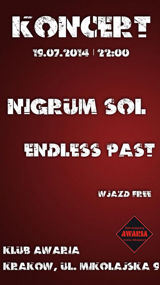 Po dugich poszukiwaniach zakoczy si casting wokalny do NIGRUM SOL. Przesuchalimy mas ludzi i jaki by owoc tych poszukiwa przekonacie si 19 lipca w KLUBIE AWARIA gdzie wystpi: NIGRUM SOL (rock/metal z Krakowa i okolic) oraz ENDLESS PAST (technical metalcore prosto z Nowej Huty). Do zobaczenia!