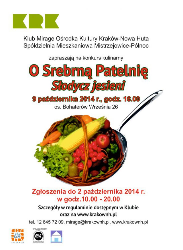Klub Mirage Oœrodka Kultury Kraków-Nowa Huta (os. Bohaterów Wrzeœnia 26) zaprasza 9 paŸdziernika br. na godz. 16:00 na finał kolejnej edycji konkursu kulinarnego dla seniorów O srebrnš patelnię, prezentujšcego oryginalne potrawy charakterystyczne dla danego sezonu. Tym razem skupiamy się na jesieni.