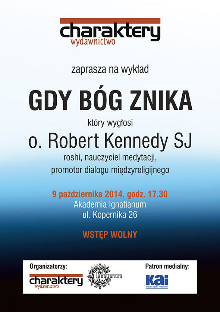 Zapraszamy na otwarty wykład Gdy Bóg znika o. Roberta Kennedy'ego SJ w Krakowie. Jest to jeden z trzech wykładów, jakie przyjeżdżajšcy ze Stanów Zjednoczonych o. Kennedy wygłasza w Polsce.