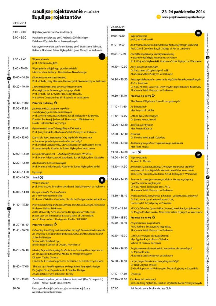 Głównym celem konferencji „Projektowanie Projektantów” jest więc prezentacja i wymiana doœwiadczeń w zakresie kształcenia na polu designu zarówno przez szkoły artystyczne, jak i inne szkoły wyższe, które w ostatnich latach włšczyły wzornictwo do swej oferty edukacyjnej. To okazja do spotkania przedstawicieli polskich i europejskich uczelni: wykładowców, studentów i absolwentów wokół zagadnienia programów oraz metod kształcenia, interdyscyplinarnoœci dziedziny sztuk projektowych, a także roli designu w gospodarce i kulturze. Do dyskusji zaproszeni zostali również przedstawiciele instytucji, od których zależy lub z którymi jest œciœle zwišzany rozwój szkół projektowych: Ministerstwa Kultury i Dziedzictwa Narodowego, Stowarzyszenia Projektantów Form Przemysłowych oraz regionalnych centrów designu. Wydarzenie zakończy Bal Projektanta.