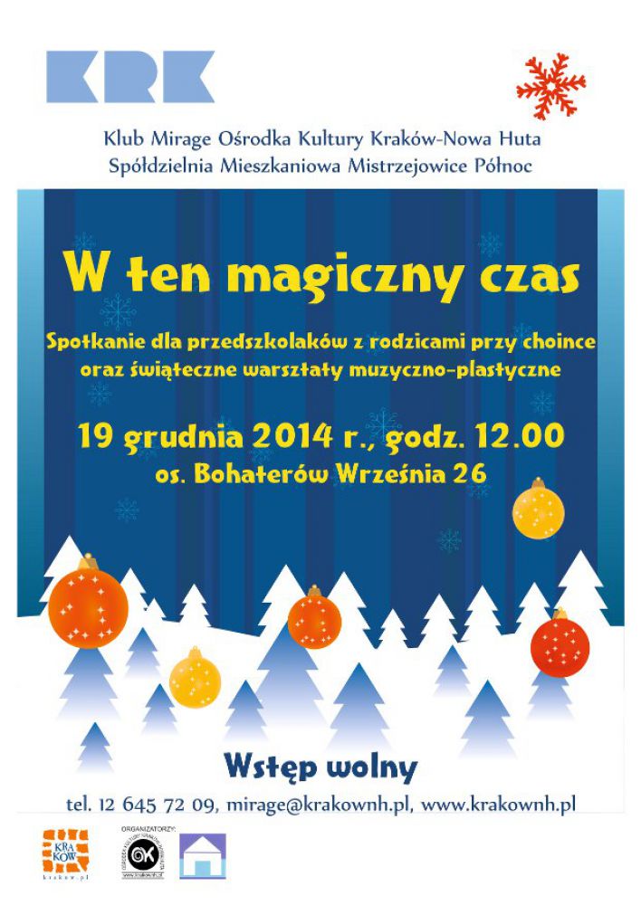 Klub Mirage Orodka Kultury Kraków-Nowa Huta (os. Bohaterów Wrzenia 26) zaprasza dzieci wraz z rodzicami na warsztaty muzyczno-plastyczne oraz spotkanie bożonarodzeniowe.