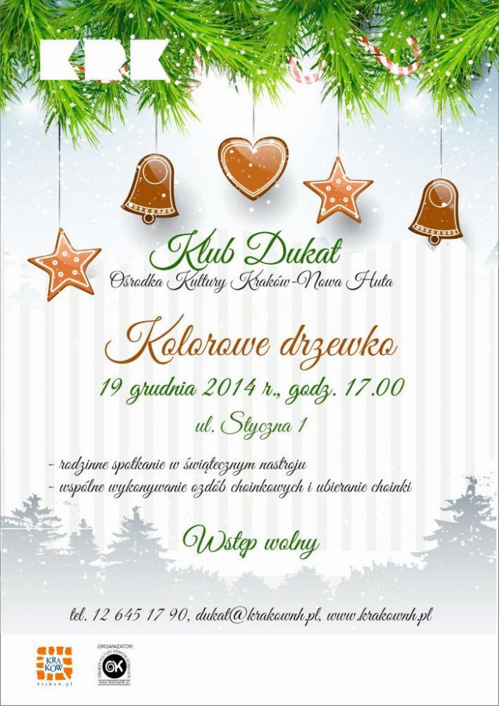 19 grudnia o godz. 17.00 odbędš się rodzinne warsztaty bożonarodzeniowe w Klubie Dukat Oœrodka Kultury Kraków-Nowa Huta (ul. Styczna 1). W programie wspólne wykonywanie ozdób choinkowych, ubieranie choinki, występy dzieci, œpiewanie piosenek œwištecznych i noworocznych, drobny poczęstunek i życzenia. Zapraszamy do wspólnej zabawy w rodzinnej i œwištecznej atmosferze.
