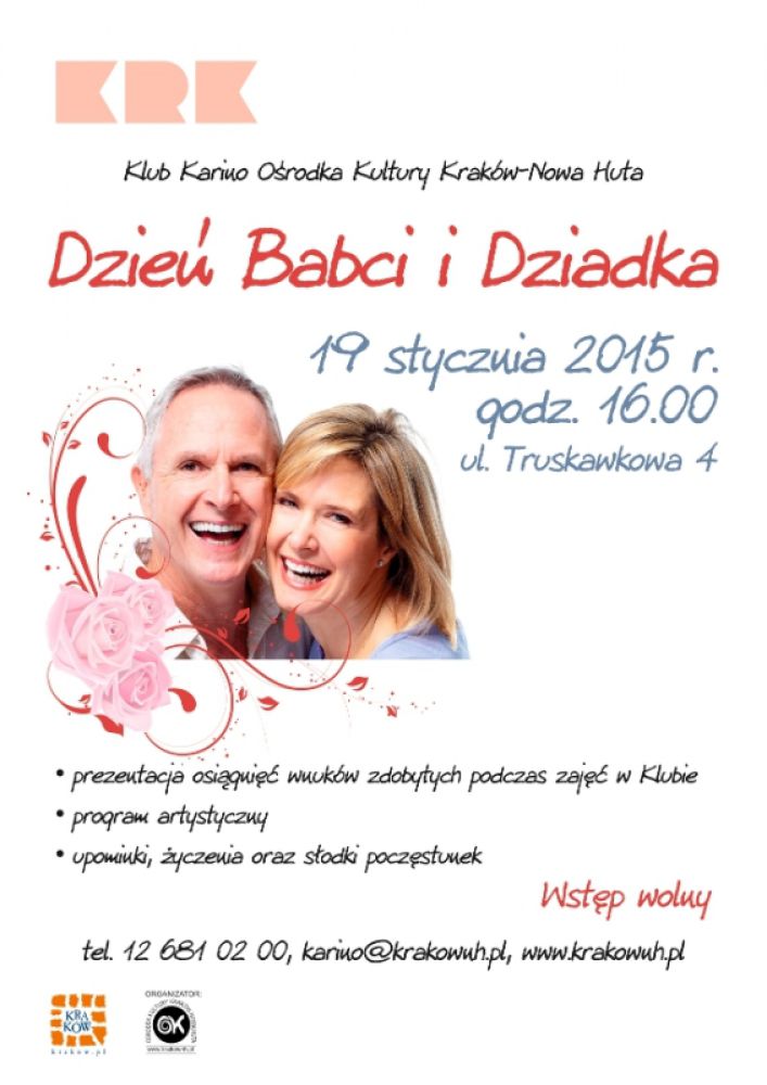 Klub Karino Oœrodka Kultury Kraków-Nowa Huta zaprasza na rodzinnš imprezę organizowanš dla babć i dziadków dzieci uczęszczajšcych na zajęcia do Klubu. Jak co roku seniorzy będš mogli poznać osišgnięcia swoich pociech. W programie m.in.: występy, wspólne zabawy, konkursy, upominki, życzenia i słodki poczęstunek.