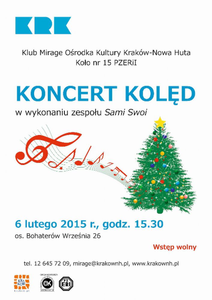 Wspólne kolędowanie to piękna polska tradycja. Kolęda jest niezwykle cennym, bo zawierajšcym proste prawdy utworem, który otwiera nas na tajemnice narodzin Chrystusa. By nie zapomnieć o tej tradycji zapraszamy wraz z PZERiI do Klubu Mirage Orodka Kultury-Kraków-Nowa Huta na koncert kolęd w wykonaniu zespołu Sami Swoi, który powstał przy Stowarzyszeniu Emerytów Rencistów i Inwalidów Przyjań w Żarkach. Usłyszymy najpiękniejsze polskie kolędy i pastorałki, które sprawiš, że powrócimy jeszcze na chwilę w magiczny klimat wišt Bożego Narodzenia.